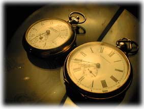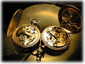 | 「時計のようで時計でないもの」 今日は、かけだし古時計マニアが執念を燃やす話にお付き合い下さい。 ![]() 今でもかけだしマニアの私ですが、さらにかけだしの頃の出来事です。 久しぶりに横浜でもうろうろしに行こうと思い立ち、立ち寄った骨董街でのこと。。。 数軒立ち並んだお店のうちの一軒に吸い寄せられるように、フラッと入り、ショーケースに並んだ懐中時計達を何げに見ると値札のない小振りな機械が目に入りました。 (なんじゃこりゃ、ま、まさか。おい、おいまさかこんなところに。でも異国情緒あふれる街と言われる横浜だし、ひょっとしてひょっとってことだって。。。) 「すいません、これ見せてください。」 「ああ、これ? これ壊れてて動かないよ。」とご店主。 「壊れたのも好きなんです。(え、えへっと愛想笑いする私)」 「なんか、振り子で動くらしいんだけど振っても動かないんだわ。」 「すいません、中見せてもらってもいいですか?」 「ほれ。」 (うむむ、ぬぬぬぬ。まさか、このイカ型の重りは自動巻懐中では??しかも、しかも、あろうことかダイアルのインデックスが10分割まさか、フランス革命の後にわずかの期間あったという10進制時の時計かぁ! そうだよ、きっとそうだよスモセコだって100分割で短針は一本針だし。。。ドキドキドキドキ。。。んでも、リューズなくて押し込むことしか出来ない棒しかないし、大体、輪列はあるけど香箱もテンプもないぞ。取れてるわけじゃなくてもともとないもののようだぞ、なんじゃこりゃ?????) 「これ、おもしろいですね。壊れててもいいのですが、おいくらでしょうか」 「ま、ン円といいたいとこだが、壊れてるから半額にしとくかな。」 (うひょぉー、マジっすか。やりー。) 「それではいただいていきます。(努めて冷静に)」 浮かれまくって店をでるとさっそく、知人に電話で報告。 「なんだか、わけわからん物が手にはいったんで、これから持っていきますね。なんか、香箱もテンプもないんだけどなんか自動巻の10進時計みたいなんですよぉ。」 「な、なにぃ、それはみたいばい。すぐもってくるばい。」 「あいよぉ。」 ガタンゴトンガタンゴトン 移動の電車の中であらためて落ち着いて観察するとどうやったって時計として機能するもののように思えない。 なんだ? これは。。。 ピンポーン