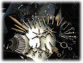 写真中、一番上の木製ハンドルが付いたものは時計師が多くの時計を効率良く巻き上げる為に使用した物。 |