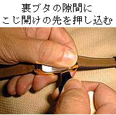ほとんどの時計にはどこかしら、こじ開けを入れ込むための隙間が開いています。 こじ開けの先端はその隙間に差し込みます。 いくら観察しても隙間が見当たらない時は、どこからこじ開けを差し込んでもかまいません。 リューズなどに当たって傷がつかない方向から開けてください。 こじ開けを入れ込む時に力を入れすぎて時計を傷つけないように注意して下さい。 じわじわと力を入れていくよりも、グッと瞬間的に力を入れた方が開けやすいです。 こじ開けはしっかりと握ってください。 また、先端が押し込まれた後、こじ開けを左右にねじってはいけません。時計に傷が付く恐れがあります。 それよりもむしろ、すこしずらした位置にもう一度こじ開けを差し込むか、こじ開けを上側に倒すようにして開けて下さい。