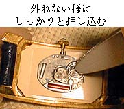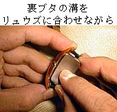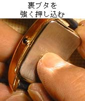 (更に気を使うのであれば、裏ブタのパッキンを外してシリコングリースなどを塗り直したり、パッキン交換を行ったりして防水性を高めます) 裏ブタをはめ込む時には、リューズの巻真(棒状の部分)が裏ブタの縁につかえないよう気をつけます。