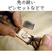 古い電池をピンセットの先などで引っかけるようにして外します。