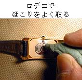 その際、ムーブメントの穴石(赤いルビーの石の部分)にロデコをくっつけると油を吸い取ってしまうのでご注意ください。 また、空気などを吹き付けると穴石に差されている油が散ってしまったり、ムーブメントにホコリがついたりするのでご注意下さい。
